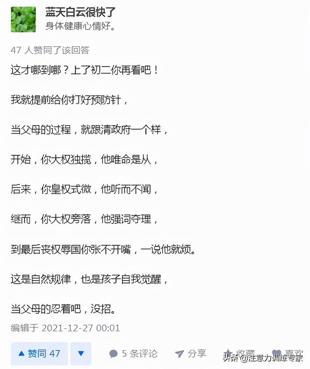 孩子早就已经不是那个需要大人喂饭、穿衣服的小婴儿了,他们渴望自己选择今天穿什么颜色的鞋子、自己安排今天的学习任务,可是家长却没有转变心态,事事都过度干涉,就比如上面提到的例子,妈妈的做法反而会破坏孩子的专注力和学习动力。