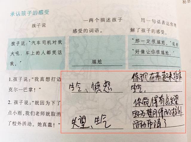 不过,刚开始这样和孩子说话确实有点别扭,比起“你别哭了”实在复杂拗口的多,庆幸的是这本书提供了非常详细的训练模拟题,就像我们上学时候做的完形填空和阅读理解一样,让家长在看完理论步骤以后,带入情景换位思考,写出答案。