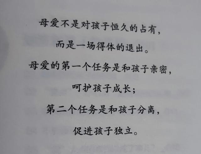 教育是指向成长的,别因为对孩子这样那样的不放心和担心,而时时刻刻把孩子牢牢地拴在自己的裤腰带上!好孩子,好身体,好孩子,大心脏!于母亲而言,尹建莉老师在她的好妈妈,胜过好老师一书的扉页,写有这样的话:母爱,不是对孩子恒久的占有,而是一场得体的退出!母爱的第一个任务,是:和孩子亲密,呵护孩子成长;第二个任务,是:和孩子分离,促进孩子的独立;家庭教育的环境与氛围,家长的气度与胸怀,家长的格局与边界,家长的眼界与视野,都在无时无刻影响着孩子!好家庭、好氛围、好家长培养的好孩子,不但要有好身体,更需要好心理;孩子必须要有抗压、受挫能力,一但失却这一能力,孩子在困难面前会畏缩,试问:这样的孩子,能飞得更高吗?能走得更远吗?