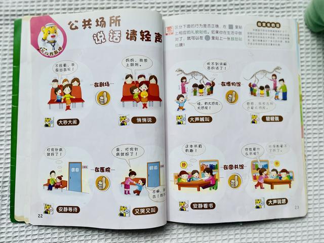 其次,翻到公共场所礼貌的内容,详细告诉他在不同场合,应该怎么做。悄悄说话、安静等待、轻轻说、安静看书是正确的,上面打了对号。大吵大闹、又哭又叫、大声喊叫、大声说话是不对的,上面打了叉号。孩子会问为什么,我们就告诉他,影响到别人,就像他看动画片、读书时被人影响一样,他就理解了。