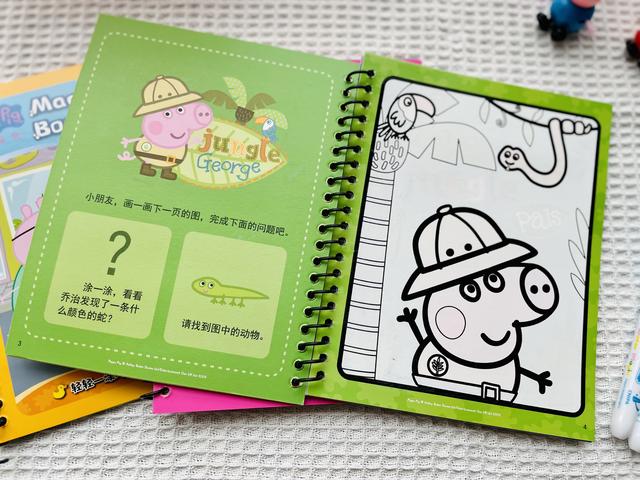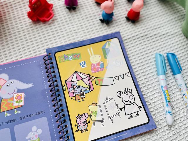 这套是小猪佩奇系列,他正喜欢这个动画片,又是第一次见这样的玩具,感到很新奇,坐在那里画个不停。要开饭了,他还严肃认真地说“我完成作业就去”。