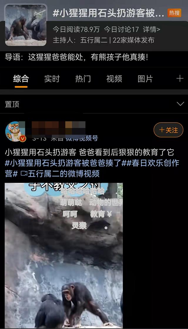 最近,一段小猩猩向游客扔石头,猩猩爸爸举起木棍追着揍的视频上了微博热搜。