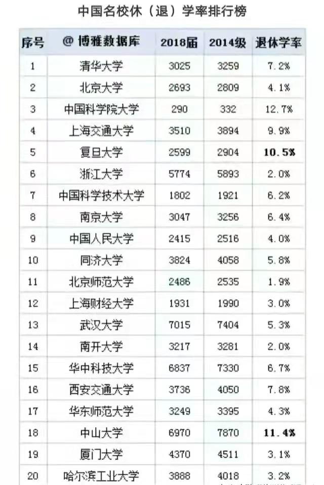 中国科学院退学率高达12.7%、中山达11.4%,顶尖高校清华7.2%、北京4.1%,退学率最低的北京师范也有1.9%。